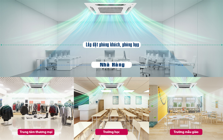 Máy lạnh âm trần LG thổi tròn 360 độ chỉ có 2 công suất là 4HP và 5HP nên phù hợp với những không gian vừa và rộng với diện tích từ 51 - 60m2 trở lên như trung tâm thương mại, nhà hàng, khách sạn, showroom, quán cafe,…