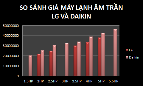 ⇒ Qua biểu đồ so sánh trên, chúng ta thấy được giá âm trần LG thấp hơn giá âm trần Daikin rất nhiều, thấp từ 3,600,000đ đến 5,600,000đ/sản phẩm cùng công suất nhưng sản phẩm Daikin có dải công suất đa dạng hơn LG. |